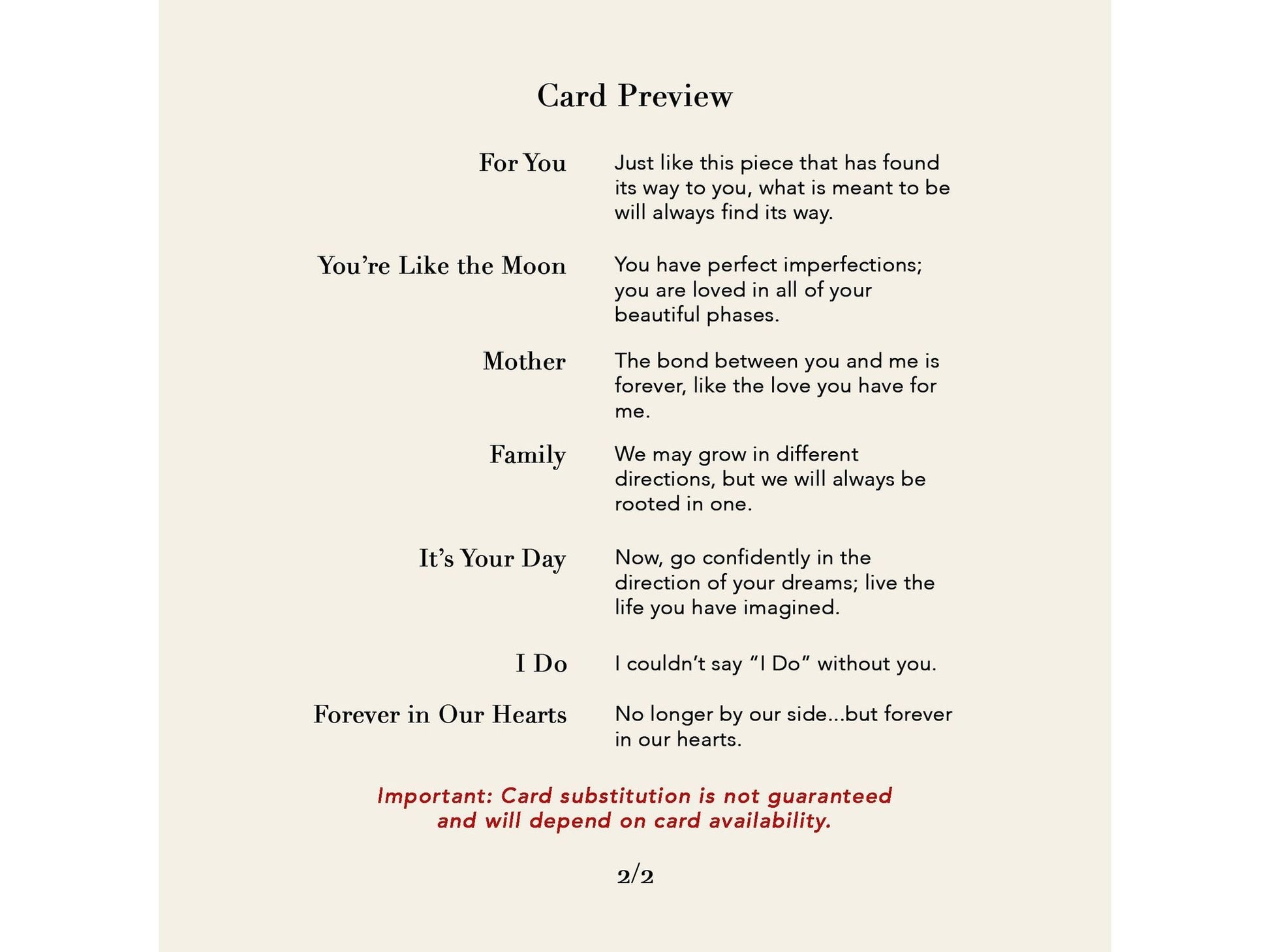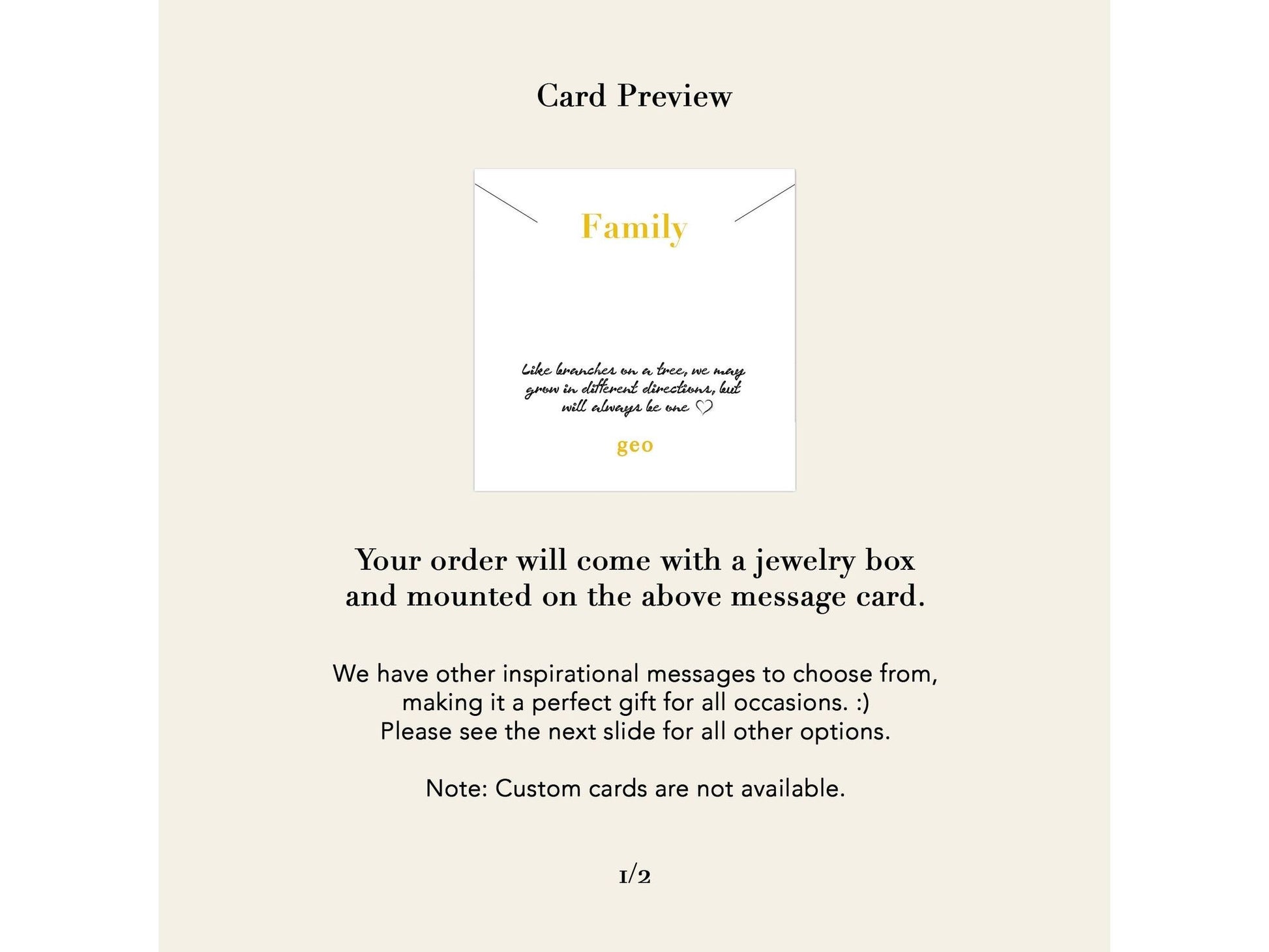 We carefully package individual items with our original jewelry cards and gift box, and we are happy to write a handwritten gift message for you if the occasion calls for it. Please simply leave us your instructions in the note section at checkout.